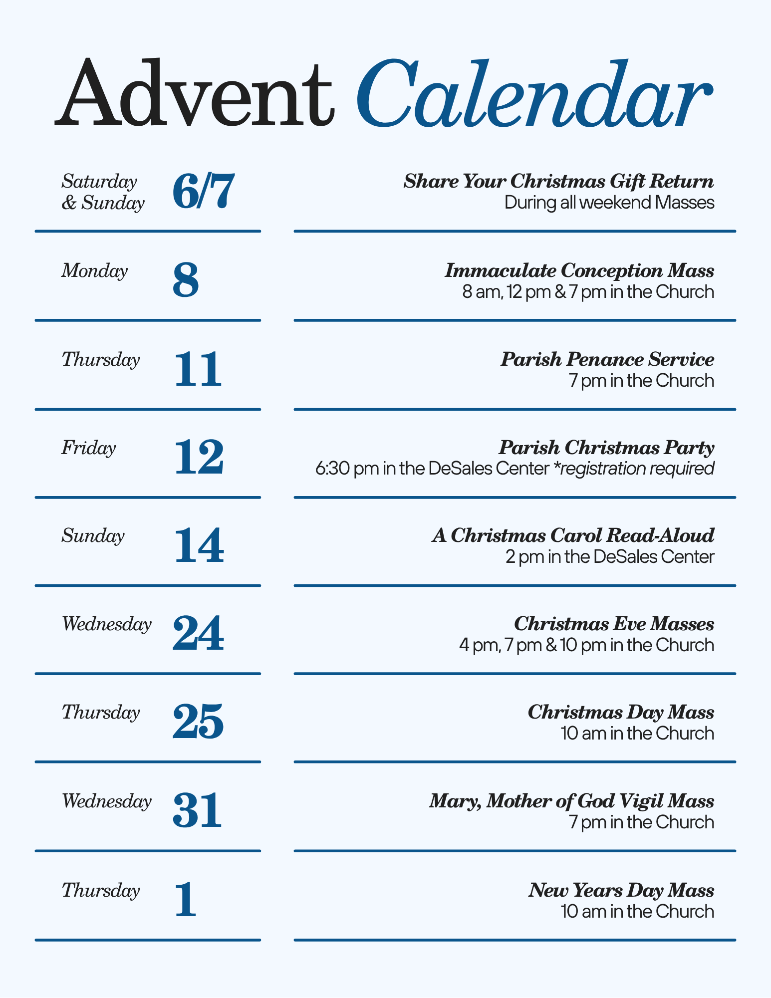 Advent is the beginning of the Catholic Church's liturgical year, consisting of the first four Sundays and subsequent weekdays before Christmas. The word "Advent" comes from the Latin "adventus," which means "a coming or approach." It is a time of preparation intended to direct the Church toward the Second Coming of Christ as we also remember the Nativity of our Lord.
